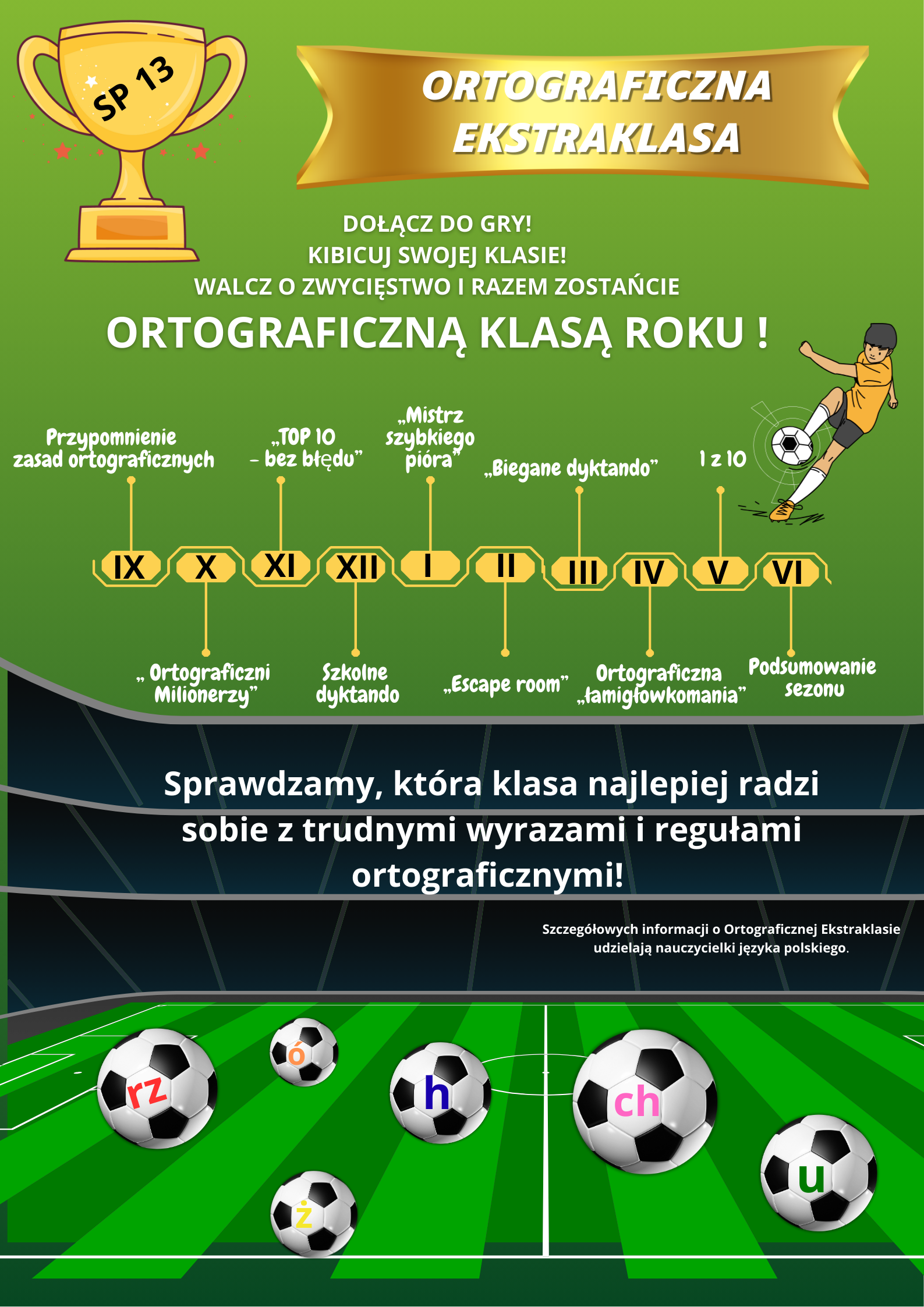 Każda klasa to jedna drużyna – wspólnie badamy zasady ortograficzne, trenujemy je i sprawdzamy, jak rośnie nasza forma językowa.